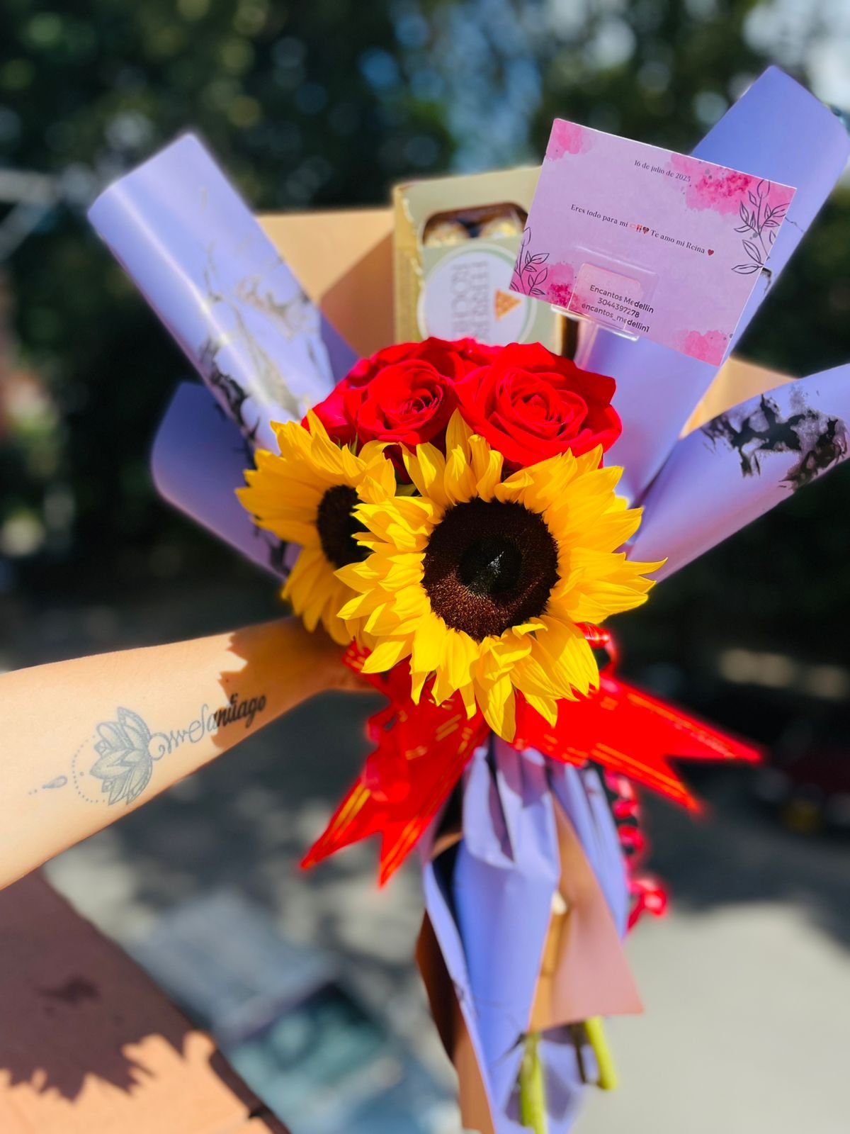 Este ramo de dos girasoles, cinco rosas y chocolates es ideal para cualquier evento: desde celebraciones románticas hasta momentos casuales. Los girasoles simbolizan admiración y felicidad, mientras que las rosas representan amor y belleza. Junto a los chocolates, este conjunto crea una experiencia sensorial completa que habla el lenguaje de los sentimientos. Además, su diseño elegante y presentación impecable hacen que sea perfecto para impresionar a tus seres queridos.