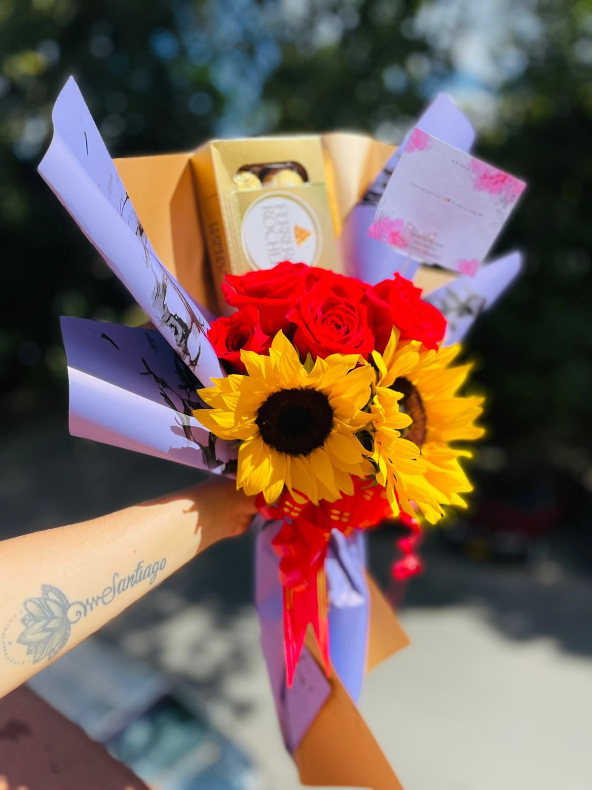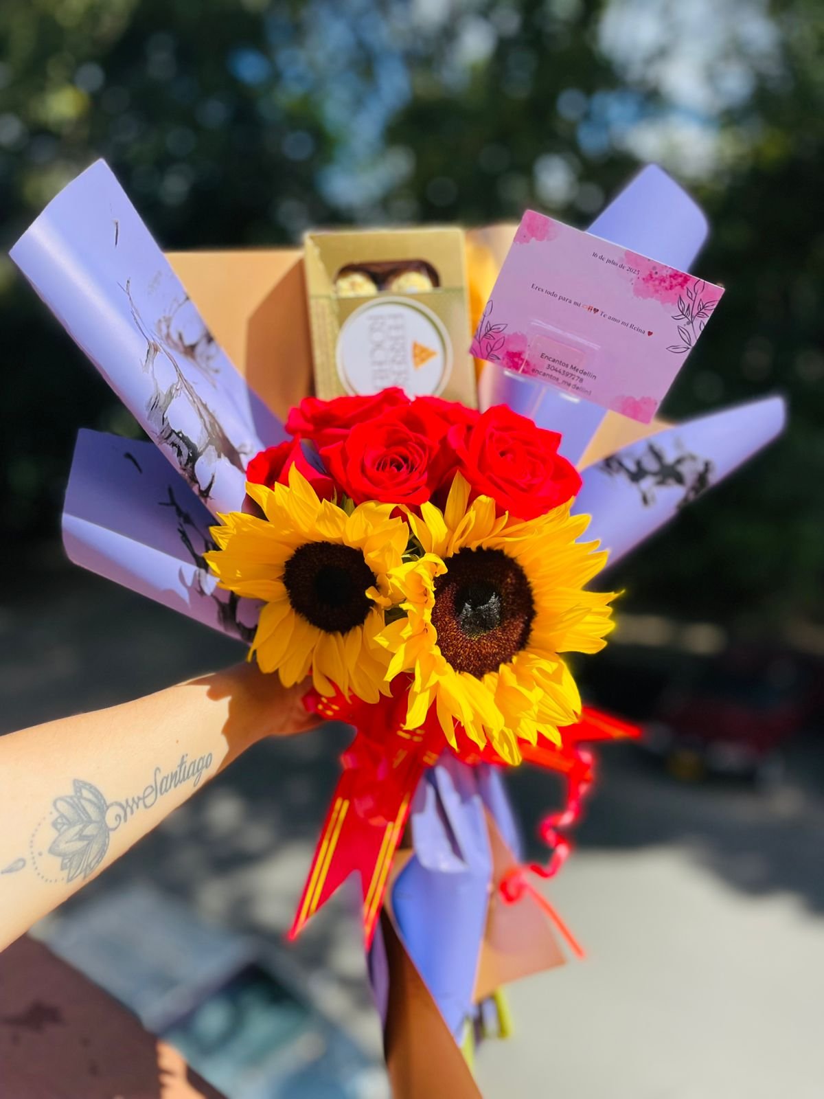 Descubre la hermosa combinación de dos girasoles, cinco rosas y una caja de chocolates que hará de cada ocasión algo especial. Este ramo único une la vibrante energía de los girasoles y la romántica fragancia de las rosas con la irresistible dulzura de los chocolates, creando un regalo completo lleno de amor y atención al detalle. Ya sea para celebrar un cumpleaños, un aniversario, o simplemente para expresar tus sentimientos, este arreglo está diseñado para crear momentos inolvidables.
